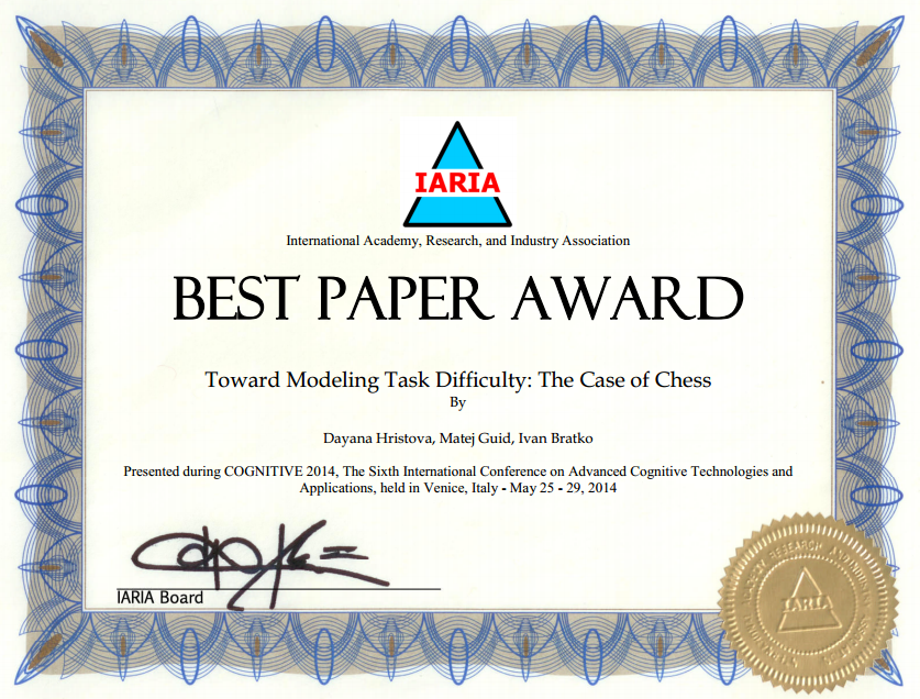 Toward modeling task difficulty: the case of chess. COGNITIVE 2014, Venice, Italy, May 25-29, 2014. The Sixth International Conference on Advanced Cognitive Technologies and Applications, pp. 211-214, 2014. IARIA. |