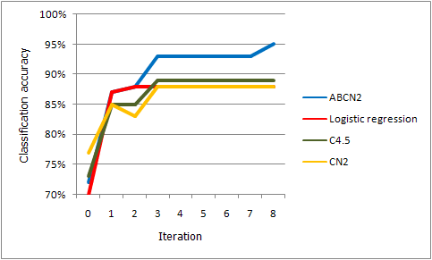The accuracies of all methods improved during the process, however ABCN2 (which also used the arguments given by the experts) outperformed all the others. The obtained results suggest that the performance of other algorithms could also be improved by adding appropriate new attributes. However, using arguments is likely to lead to even more accurate models.