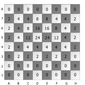 The experts designed a look-up table (left) with predefined values for the pawns that are on the color of the square of the bishop in order to assign weights to such pawns. According to Watson's definition, centralisation of the pawns has been taken into account. Several other attributes used this look-up table to assess heuristically an influence of such bad pawns on the evaluation of the bishop. Note that the table is designed for determining the goodness of the pawns that are on the color of the square of the bishop of black player. The reversed look-up table would be appropriate for determining bad bishops of white player.
